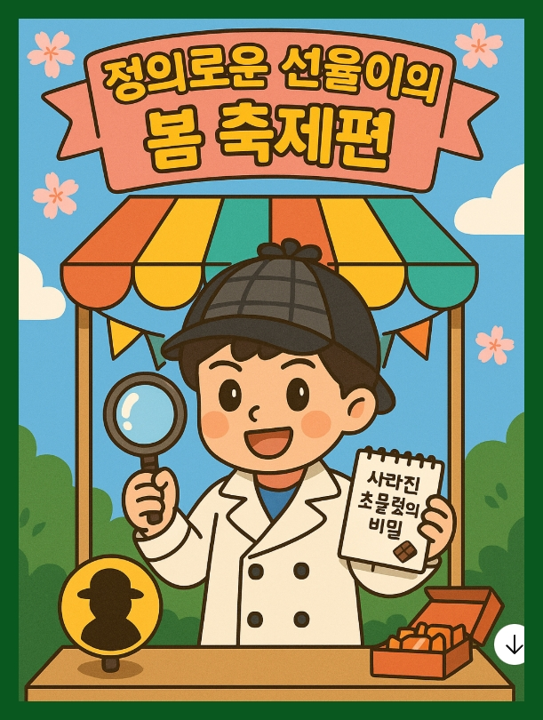 🌸 정의로운 선율이의 학교 대모험 – 봄 축제편 봄꽃이 피기 시작한 3월, 학교는 새로운 학년을 맞이할 준비로 분주했다. 선율이는 3학년 1반으로 배정되었고, 놀랍게도 민호와 소영이와 또 같은 반이 되었다. “우리 진짜 운명인가 봐~” 민호가 어깨동무를 하며 웃었다. “근데 이번엔 재훈이는 3반이래.” “괜찮아! 점심시간마다 운동장에서 볼 수 있잖아.” 교실에는 새로운 친구들도 많았다. 그중 한 명은 말수가 적고 조용한 아이, 태윤이였다. “선율이, 쟤 좀 이상하지 않아? 맨날 혼자 있어.” 민호가 수군거렸지만, 선율이는 고개를 저었다. “우리가 먼저 다가가 보자.” 다음 날, 선율이는 태윤이에게 다가갔다. “같이 축구할래?” 태윤이는 고개를 푹 숙이며 말했다. “…난 못해.” “괜찮아! 잘하는 것보다 재미있게 하는 게 더 중요해.” 그날 이후로 태윤이는 조금씩 선율이 무리와 어울리기 시작했다. 처음엔 조용했지만, 점점 웃음도 늘고, 쉬는 시간에도 함께 놀았다. 🎪 봄 축제 준비 4월이 되자 선생님이 말했다. “얘들아! 올해는 ‘봄 축제’가 열릴 거야! 우리 반도 부스를 운영해야 해요.” 아이들은 신이 나서 손을 들었다. “슬라임 만들기요!” “종이 꽃 팔찌!” “뽑기 게임!” 선율이가 말했다. “우리 뭔가 특별한 걸 해보자! ‘정의의 탐정카페’ 같은 거 어때?” “오, 그게 뭐야?” “손님이 들어오면 단서를 주고, 작은 미스터리를 푸는 거야! 정답 맞히면 선물!” 아이들의 눈이 반짝였다. 선생님도 웃으며 말했다. “좋아요, 탐정카페! 반 이름은 ‘3-1 정의 탐정단’으로 할까요?” 선율이는 자연스럽게 기획 담당이 되었고, 민호는 소품팀, 소영이는 포스터 디자인을 맡았다. 태윤이는 조용히 손을 들었다. “…저는 미스터리 이야기 만들고 싶어요.” 선율이는 환하게 웃었다. “좋아! 이야기 작가는 태윤이!” 태윤이는 책상 앞에서 조용히 무언가를 적기 시작했다. 📜 제목: 사라진 초콜릿의 비밀 내용: 손님은 추리 단서를 보고, 누가 초콜릿을 훔쳐갔는지 맞히는 게임 태윤이의 아이디어는 완벽했고, 반 친구들도 놀랐다. “우와, 진짜 작가 같다!” “태윤아 너 대박이야!” 태윤이는 쑥스럽게 웃었다. 선율이는 옆에서 말했다. “이건 태윤이 없었으면 못 만들었어!” 🕵️ 축제 당일, 사건 발생?! 축제 날. 3-1 탐정카페에는 손님들이 줄을 섰다. 선율이와 친구들은 흰색 코트를 입고 ‘탐정 모자’를 썼다. 태윤이는 이야기책을 들고 설명을 담당했다. “단서를 다 보면 누가 훔친 건지 맞혀보세요!” 아이들은 단서를 맞히며 즐거워했고, 3-1반은 금세 인기 부스가 되었다. 그런데! 쉬는 시간, 선율이가 급하게 달려왔다. “큰일이야! 진짜 사건이 생겼어!” “뭔데?” “경품으로 준비한 초콜릿 상자 하나가 사라졌어!” 모두가 놀라며 교실을 수색했다. “혹시 손님 중에 누가 가져갔나?” “설마 우리 반 친구는 아니겠지…” 그때 태윤이가 조용히 말했다. “내가 CCTV 근처에서 누군가 걸어가는 걸 봤어… 초콜릿 박스를 들고 있었어.” 선율이가 물었다. “누구였어?” 태윤이는 잠시 말이 없었다가 입을 열었다. “같은 반 친구는 아니야. 3반에 있는 아이 같았어… 키가 작고 모자를 깊게 눌러쓰고 있었어.” 선율이는 고개를 끄덕였다. “좋아. 그럼 선생님께 먼저 말씀드리자. 그리고 누군지 찾더라도 절대 손가락질하지 말자.” 잠시 후, 교무실에서 확인된 결과, 초콜릿을 들고 간 건 3반의 민재였다. 민재는 얼굴이 하얗게 질려 교실로 왔다. “미안해… 그냥 하나만 먹고 돌려주려고 했어…” 아이들은 술렁였지만, 선율이는 나섰다. “우리 탐정단은 사람을 미워하진 않아. 하지만 정직해야 한다는 건 꼭 지켜야 해.” 선생님도 덧붙였다. “정말 중요한 건, 실수 뒤에 솔직해지는 용기란다.” 민재는 고개를 깊이 숙였다. “다시는 그러지 않을게…” 태윤이는 가만히 자신의 노트에 무언가를 적었다. “진짜 미스터리는 사라진 초콜릿이 아니라, 용기의 무게다.” 🏆 마무리, 모두가 주인공이 된 날 축제가 끝난 뒤, 교장 선생님이 전교생 앞에서 발표했다. “올해 최고의 부스로 뽑힌 반은… 바로! 3학년 1반입니다!” 모두가 박수를 쳤다. 선율이, 태윤이, 민호, 소영이… 그리고 교실 뒤에서 미소 짓던 민재까지. 선율이는 트로피를 높이 들며 말했다. “정의는 범인을 찾는 게 아니라, 모두가 다시 친구가 되는 거야!” 그 말에 모두가 고개를 끄덕였다. 태윤이는 작은 목소리로 말했다. “이 이야기도… 동화로 쓰면 좋겠네.”