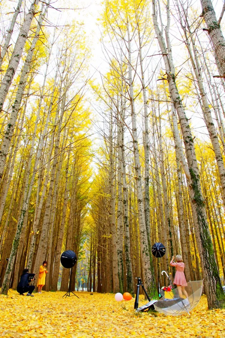 정면 촬영: 은행나무 숲의 깊이감 표현