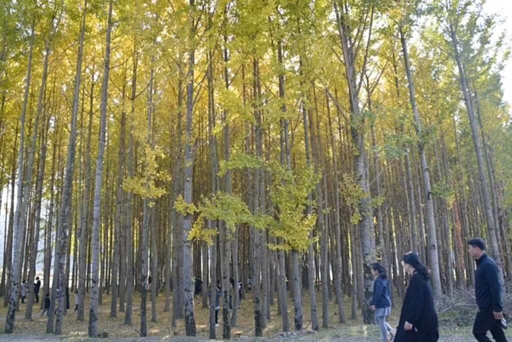 숲의 구조: 은행나무들이 빽빽하게 심겨져 자작나무 숲 같은 이국적 경관